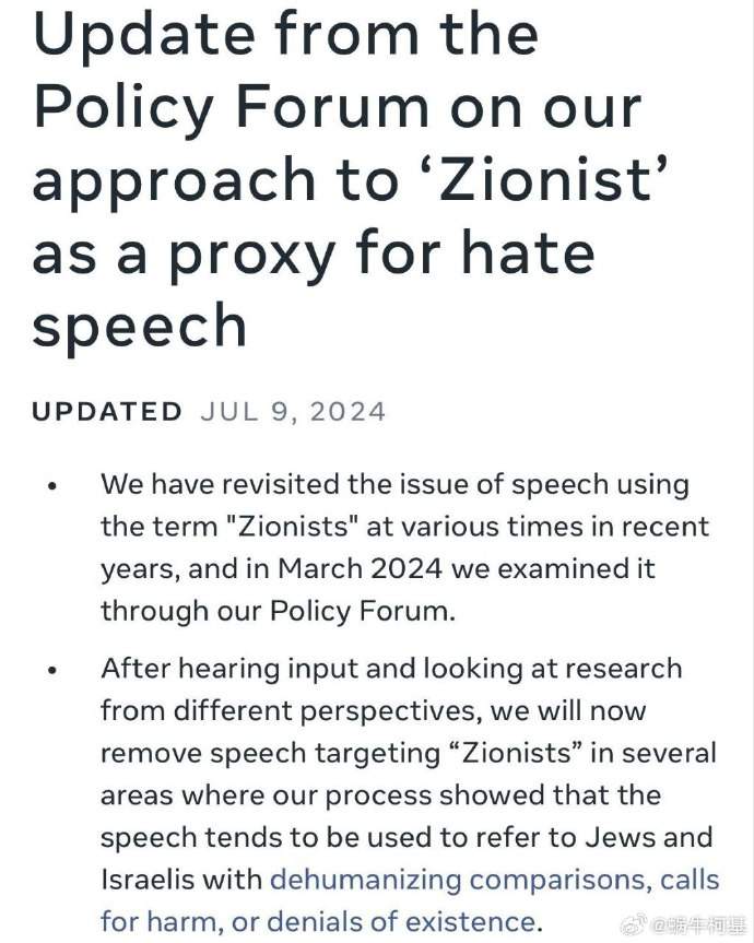 🇺🇸🇮🇱 臉書修改仇恨言論政策,禁止批評“猶太復國主義者”的帖子。
