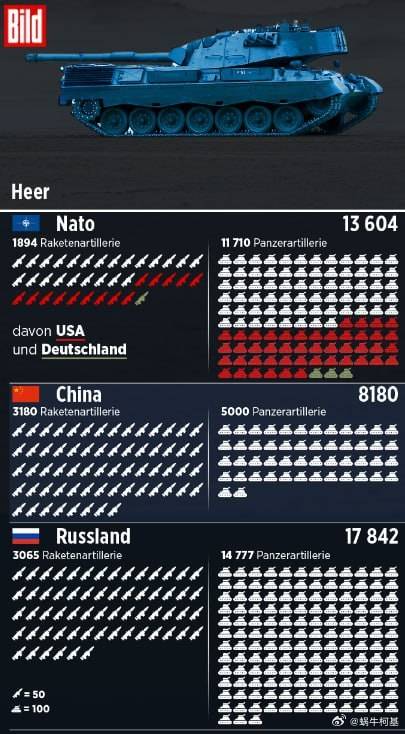 ▫️北約國家總共擁有1,894門多管火箭炮和11,710門自行火炮。僅俄羅斯在這兩項指標上都領先於所有國家。