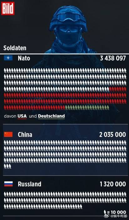 ▫️北約國家軍隊共有3,438,097人。其中幾乎一半是美國陸軍(圖中以紅色突出顯示)。這比俄羅斯和中國的總和還多。