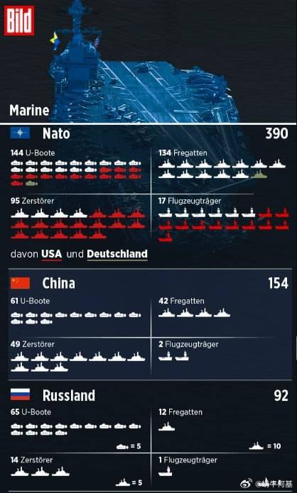 ▫️就驅逐艦(95艘)、潛艇(144艘)、護衞艦(134艘)和航母(17艘)的數量而言,北約領先於俄羅斯和中國的總和。