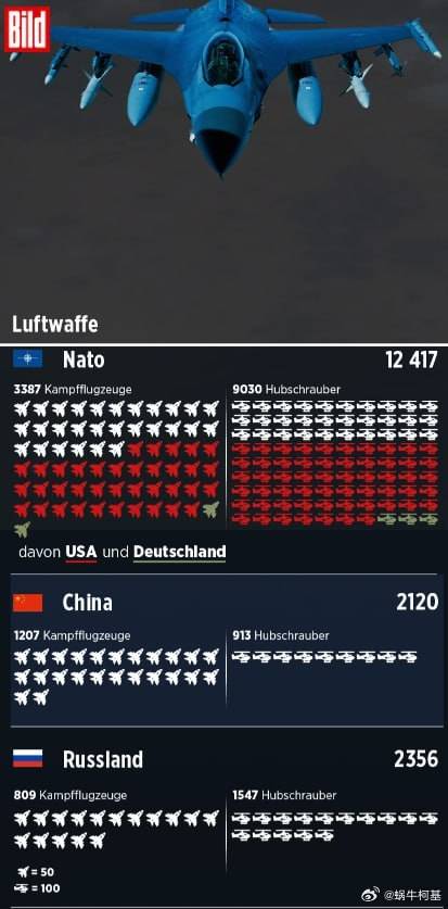 ▫️北約擁有3,387架戰鬥機和9,030架直升機。這比俄羅斯和中國的總和還多。