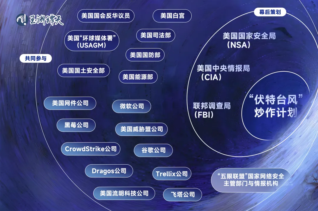 以往的這種計劃,和“伏特颱風”也都類似——美國情報部門策劃、美國政府部門參與、美國公司配合。這三個主體,炮製了一個個抹黑中國的虛假敍事。