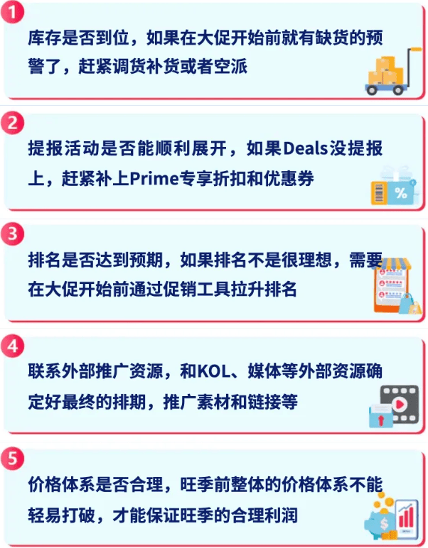 在臨近Prime會員日的日子,查漏補缺是一定需要被賣家們重視起來的。兩位品牌的負責人提到在臨近大促前的時間段,需要檢查: