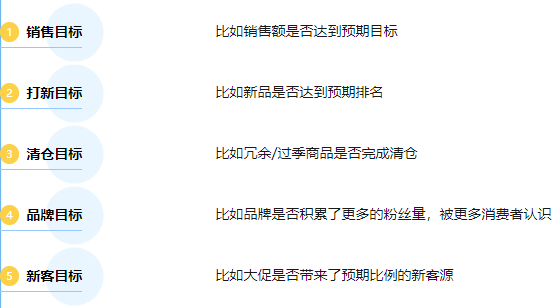 **總結:**對大促的目標設定應該是多維度的,賣家可以從以下幾個方面考量: