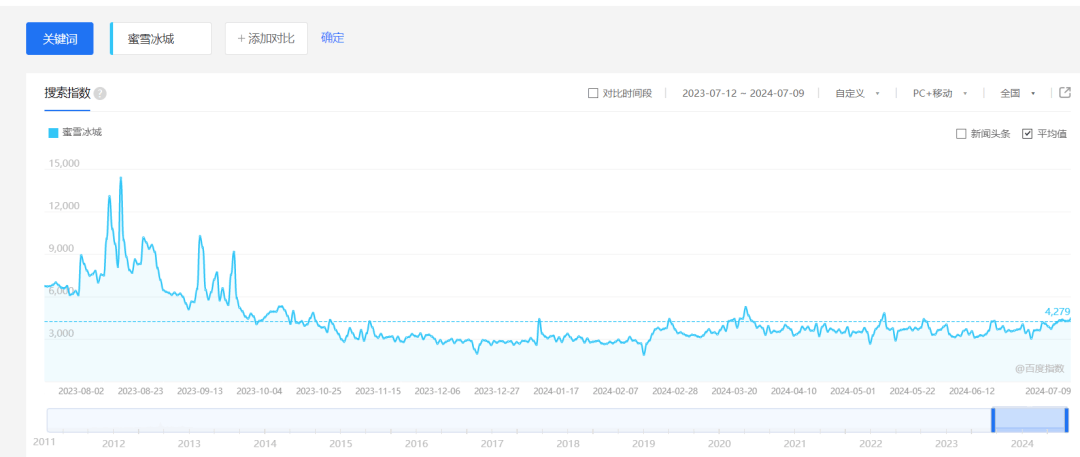 今年夏天,打工人被定價4-8.9元的冰杯刺客傷害到了,迫切需要低價冰杯。此時,雪王推出1元冰杯的姿態,顯然是能迎合情緒的。它也需要這份熱度。最近十個月,蜜雪冰城的熱度呈下滑趨勢,百度指數直線下跌至4千左右,遠不及2023年8-9月的熱度水平。