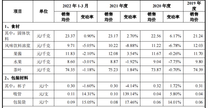 蜜雪冰城在最新的招股書中並未披露經銷商購買吸管等包裝材料的單價。但是據2022年招股書披露的信息,蜜雪冰城在2022年1-3月期間,每個杯子、吸管、包裝袋的銷售均價分別為0.3元、0.11元、0.09元,合計約為0.5元。