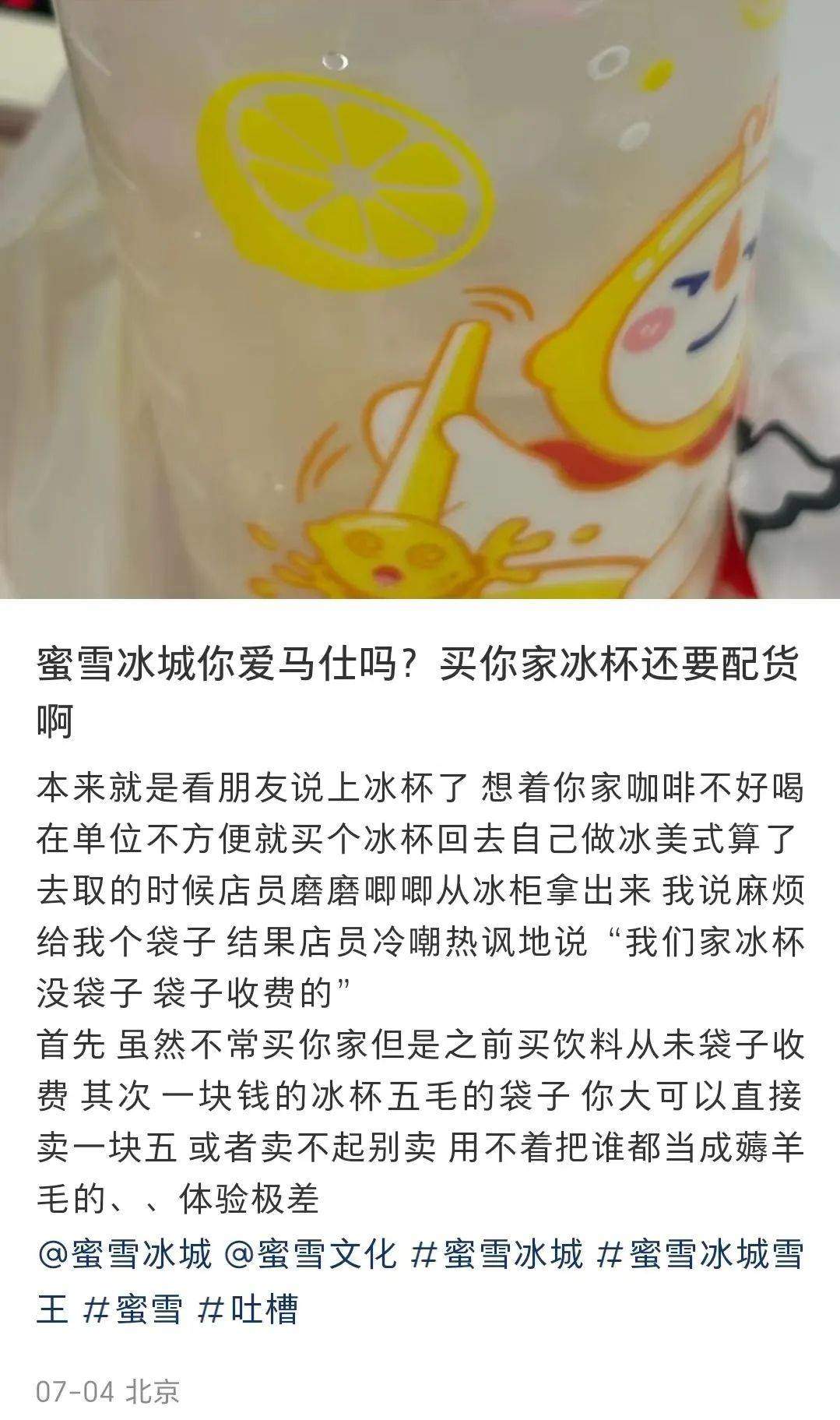 一塊錢的冰杯,在蜜雪冰城似乎走出了愛馬仕“配貨”的風範。有用户稱,需要購買四塊錢的檸檬水才能給一個冰杯。