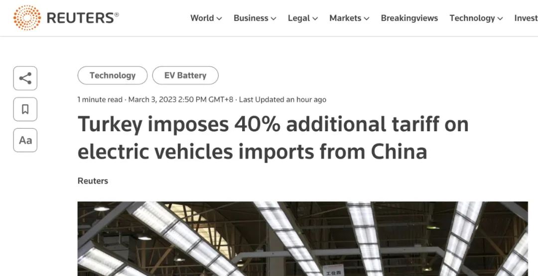 大伊萬聽到這個消息的第一反應,是去翻之前的合訂本,這一翻果然翻到了,2023年3月,咱們才剛討論過,土耳其官方才發佈《公報》,宣佈對從中國進口的電動汽車整車加徵40%的關税。由於之前土耳其對我們的電動車已經加了10%的税,現在又把税率提高了40%,相當於收了我們50%的税,當時外界一片罵聲。