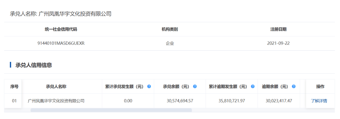 據上海票據交易所顯示,截止到今年6月底,華宇集團持股80%的廣州鳳凰華宇文化投資有限公司商票累計逾期3581萬元,逾期餘額3002萬元;