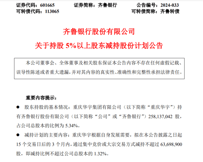 日前,A股上市城商行齊魯銀行發佈了持股5%以上股東的減持公告。公告顯示:重慶華宇集團有限公司持有齊魯銀行股份有限公司約2.58億股,佔公司總股本的比例為5.34%。重慶華宇根據自身發展需要,擬在本公告披露之日起15個交易日後的3個月內,通過集中競價或大宗交易方式減持不超過約6370萬股,即減持比例不超過公司總股本的1.32%。