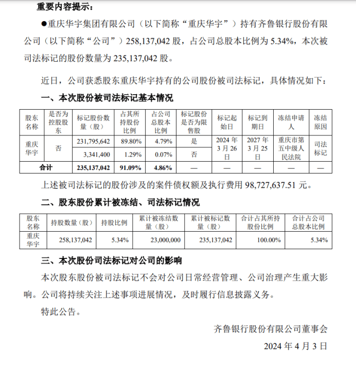 四是擬減持的股份情況**,絕大部分仍處於質押狀態。**華宇集團持有的大部分齊魯銀行股份,近段時間以來不停地在質押與解押之間跳動,在今年4月份還被重慶市高院司法標記了2.35億股,約佔總持股數的91%,涉及案件的債權金額及執行費僅有0.98億元。