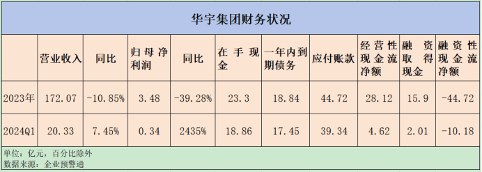 **只不過從華宇集團的財務數據來看,並不樂觀。**據企業預警通數據披露的華宇集團2023年年報和2024年一季報顯示,2023年度,華宇集團營業收入172.07億元,同比下滑10.85%,歸母淨利潤3.48億元,同比大幅下滑39.3%,還能保持盈利已經很不錯了,不過在手現金僅有23.3億元,同比上年末的38億元還是少了有15億元,而同期的一年內到期債務有18.84億元,應付賬款有44.7億元,在手現金已經難以覆蓋年內到期債務和應付款項,這種情況到了今年1季度仍然沒有好轉;