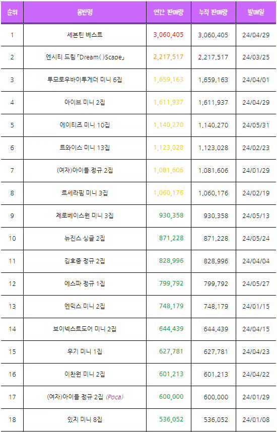 根據2024年Circle Chart專輯銷量TOP 40數據顯示,截止到5月31日,(G)I-DLE、ZB1、PLAVE發行的POCA版專輯便位居17、20、34位;而SEVENTEEN、New Jeans等發行的小卡專輯版本同樣打入榜單前列。