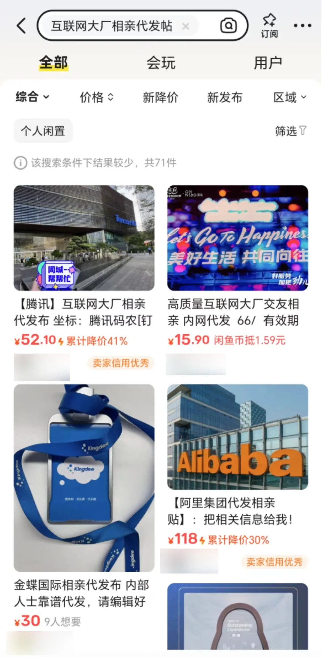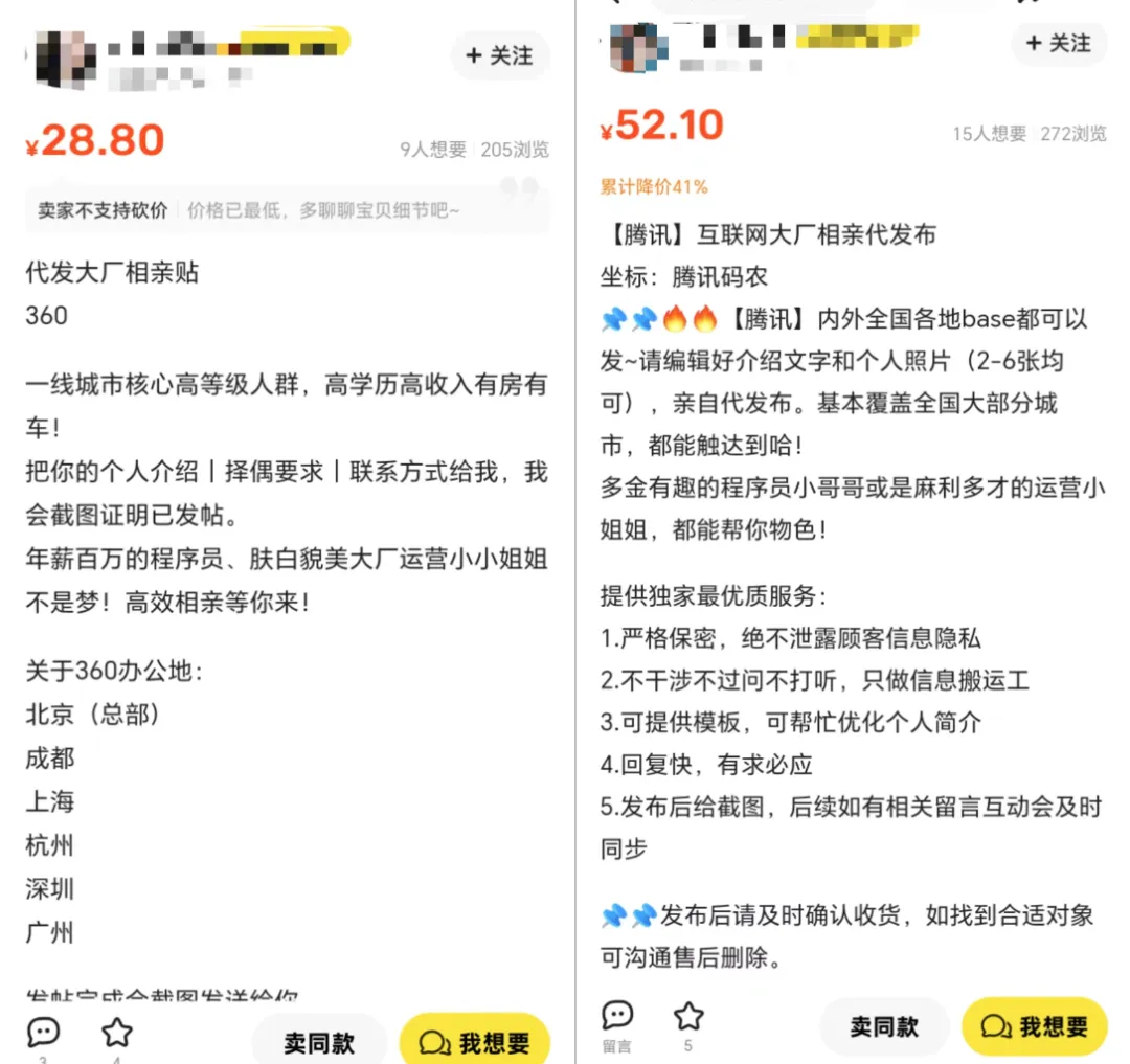 當前,“互聯網大廠相親代發帖”的生意主要集中於閒魚和小紅書兩個平台。**當記者在閒魚以“互聯網大廠相親代發帖”進行檢索時,頁面共顯示了71條結果,價格主要在30~199元之間。“**66元包括代發和文案優化。”售賣百度代發帖的賣家嘉蕊告訴《IT時報》記者,她的服務是將文案發到論壇上,保留10天后將會刪帖,此外,會向買家強調兩方面的事項:其一,不保證有異性聯繫,所做之舉僅是代發;其二,保護好個人隱私和錢財。