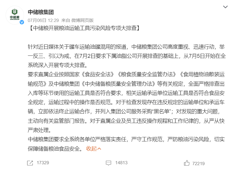 在油罐混裝事件被揭露後,中儲糧只是發了一個全面排查的通告,等於是自糾自查。這種“自糾自查”,能有多大的信服力?會不會陷入某種形式主義?誰能保障以後不會出現同樣的事?匯福糧油雖是民企,卻是中國500強的大民企,也是三河市的納税大户。三河市是什麼級別?是一個縣級市,由河北廊坊市代管。一個縣級市能徹查一家中國500強的納税大户嗎?會不會出現地方保護主義?