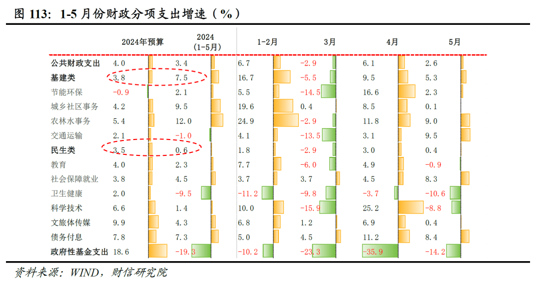 從公共財政支出結構看,1-5月份,教育、社保、衞生健康等民生領域公共財政支出增速僅0.6%,不僅大幅低於基建類財政支出增速(7.5%),也明顯低於年初預算增速(3.5%)。