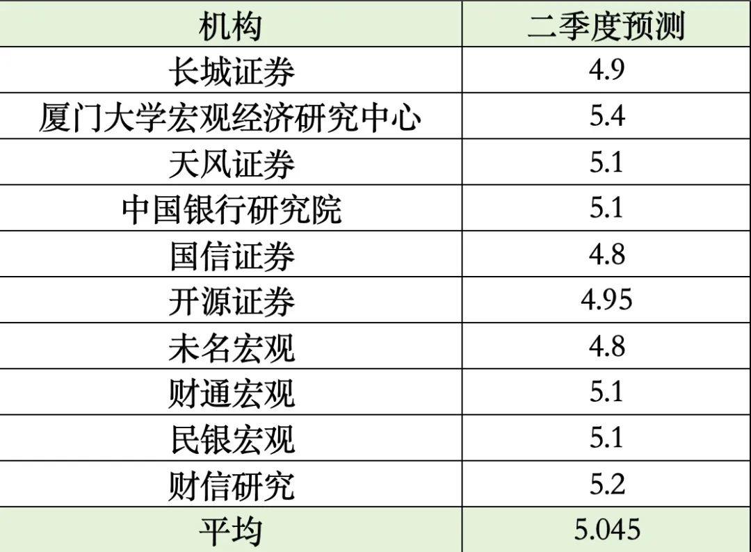今年一季度,GDP同比增長5.3%,超出市場預期,二季度增速預計略有放緩。根據時代財經不完全統計,10家機構對於二季度增長預測均值為5.05%,其中6家預測值在5%以上,4家預測在4.8%-5%之間。
