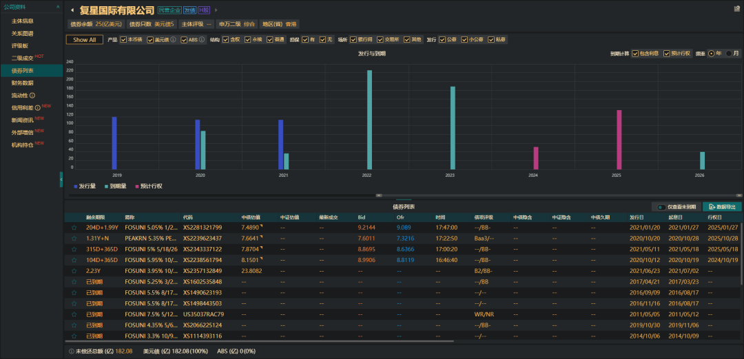 在7月2日這筆債務本息兑付後,qeubee數據顯示,復星國際當前存續5只美元債,債券餘額為25億美元。