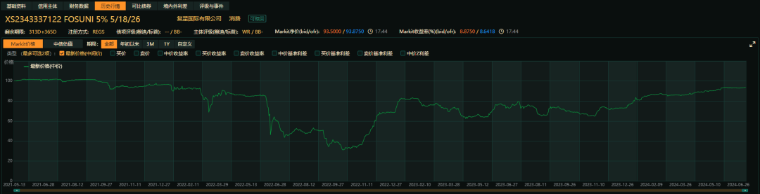 數據顯示,截至2024年6月底,“FOSUNI 5.95 10/19/25”、“FOSUNI 5 05/18/26”、“FOSUNI 5.05 01/27/27”三隻美元債價格分別較年初上漲15.65%、26.62%、36.59%。