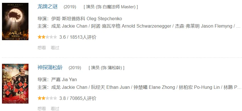 翻看成龍近十年的作品,除了2017年有一部《英倫對決》上了7分,其餘的基本都在3-5分間徘徊。