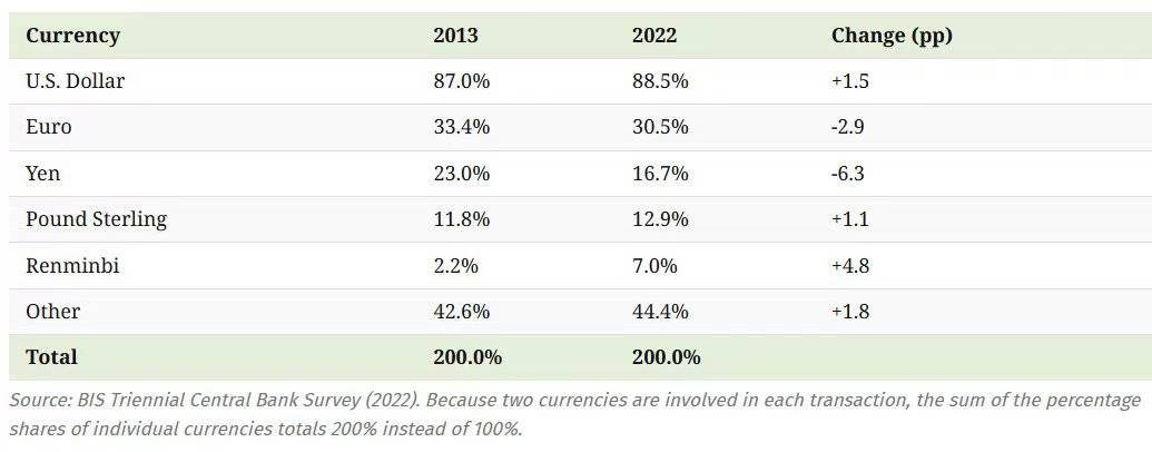 2. 與全球貿易金融相關的貨幣數據是這樣的:2022年全球“外匯交易份額”中,美元佔比88.5%,歐元30.5%,日元16.7%,英磅12.9%,人民幣7%,其它44%。總份額是200%,因為交易是雙邊的。如果所有貨幣都只和美元兑換,美元份額理論最高值是100%,不比88.5%高多少。所以,從外匯交易角度,世界是美元中心化的。