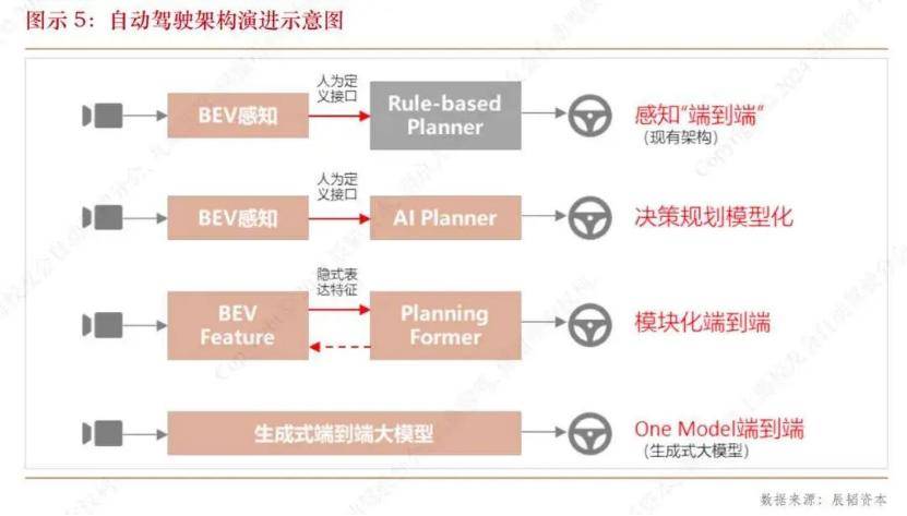據辰韜資本研報顯示,自動駕駛架構的演進可以分為四個階段,分別是感知端到端;決策規劃模型化;模塊化端到端;單一模型端到端。