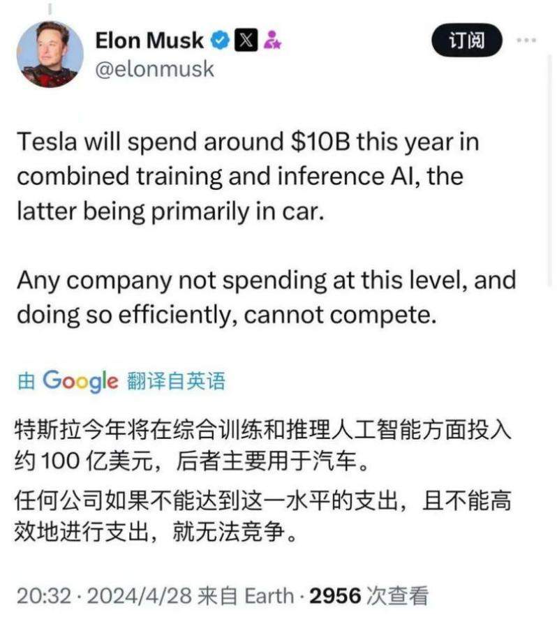 但端到端對自動駕駛來説,可能是“有效解法”,但卻不一定是“最佳解法”。馬斯克曾發文表示,特斯拉今年將在綜合訓練和推理人工智能方面(主要用於汽車)投入約100億美元,任何公司如果不能達到這一水平的支出,且不能高效地進行支出,就無法競爭。
