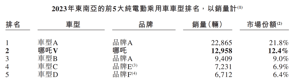事實上,哪吒汽車已經在東南亞市場挖到了第一桶金。以上險量計,哪吒汽車是2023年東南亞新能源乘用車排名前三的品牌。其中,哪吒V(後改款為哪吒AYA)的銷量為12958輛,在純電動乘用車銷量排名中位於第二位,市場份額為12.4%,在小型純電動乘用車銷量排名位於中第1位,份額為52.0%。