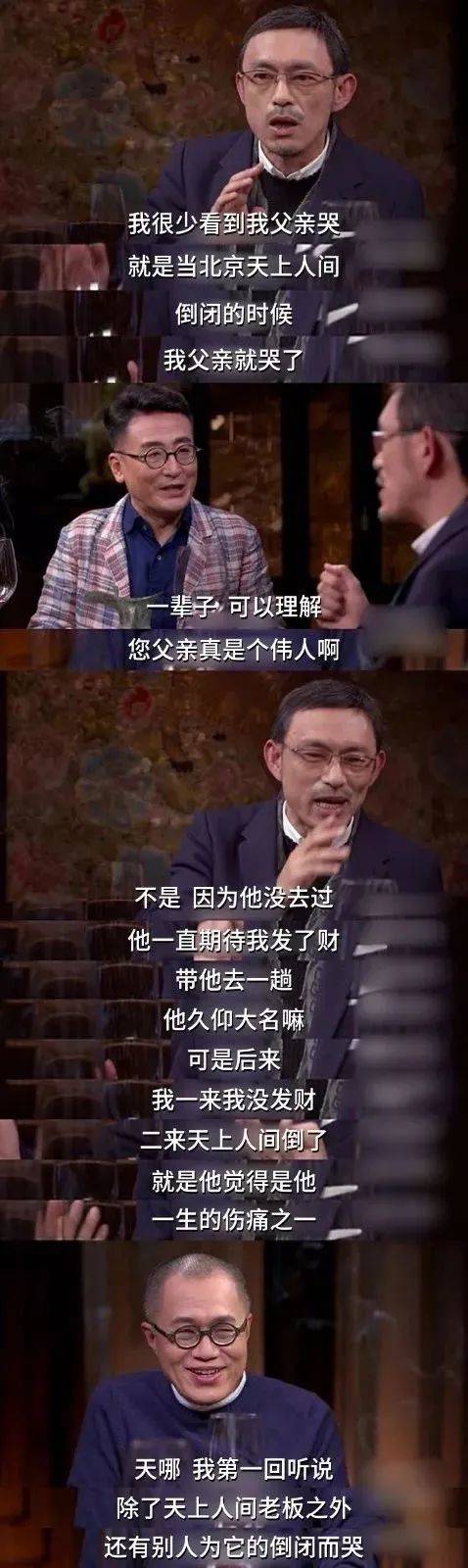 父親最大的遺憾是沒去過天上人間,當年北京天上人間倒閉的時候,馬家輝的父親哭了,他一直等着兒子發財帶自己去瀟灑一回,誰知兒子沒發財,天上人間還倒閉了。