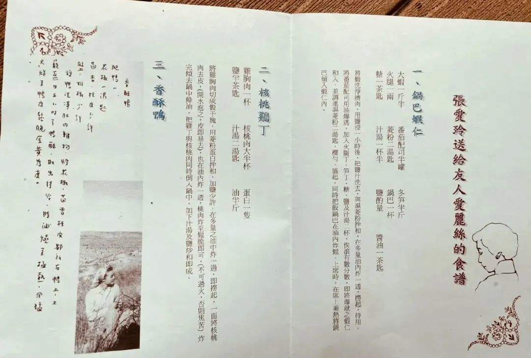 他用心找到浸會大學多年前的一張晚宴菜單,題為“張愛玲送給友人愛麗絲的食譜”,有三道菜的名稱、食材與做法:鍋巴蝦仁,核桃雞丁,香酥鴨。