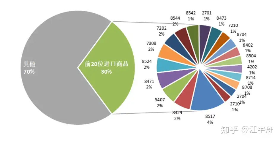 在前十大商品中,會觸及印尼加徵關税的商品主要就是紗線,部分絕緣體材料或許會涉及到陶瓷,但佔比也較低,總體來看有沒有到3%-5%都難説。這裏面就涉及到一箇中-印尼外貿結構的特點,商品構成非常分散。如果畫成圖,大概長這個樣子。在如此分散的板塊內,區區鞋類、服裝、紡織品、化妝品和陶瓷這幾項的佔比也就可想而知了。中國目前對印尼的出口,還是以諸如基建、通信、電器、石化等行業的工業製成品和零部件為主。
