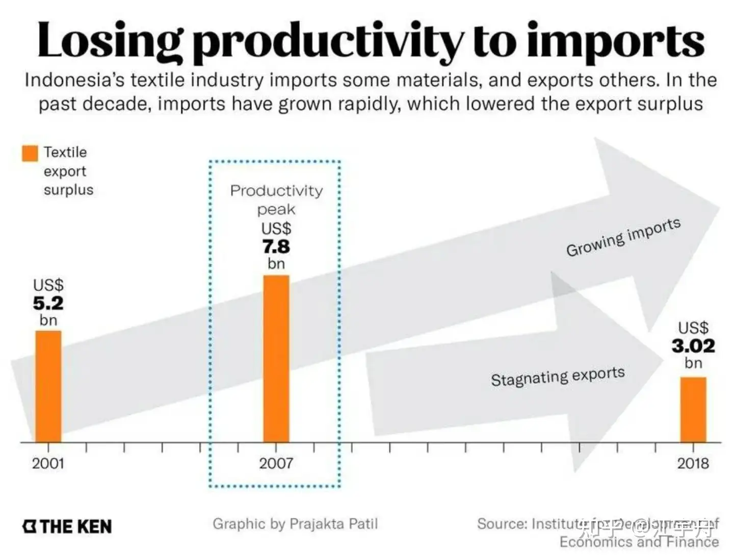 從佔比來看,確實比較高,但金額有限,服裝及配飾貿易量一年20億美元,鞋類一年不到3.7億美元(根據國際貿易中心的數據,2022年中國向印尼出口紡織品全部總額約為65億美元)。而印尼的紡織業總額約在500億美元。而且根據印尼官方披露的數據,中國部分該類商品的出口佔比還在下滑,以服裝為例,中國服裝在印尼的市場份額已從2018年的53.25%下降到2023年一季度的36.74%[[1]](https://www.zhihu.com/question/660430807/answer/3549570207)。