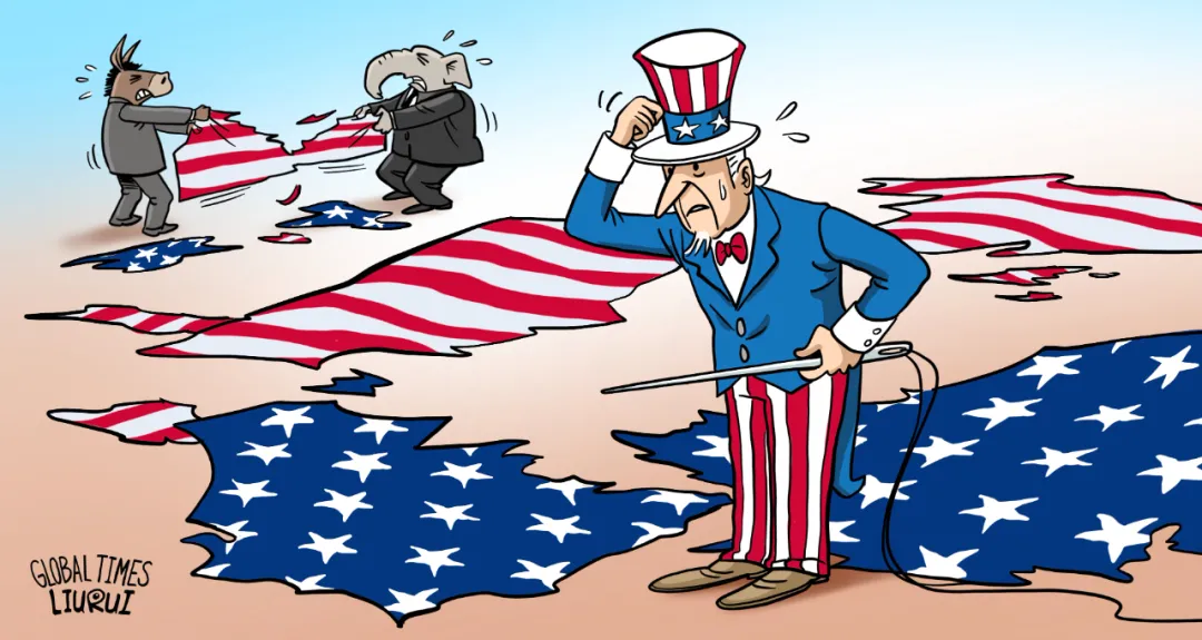 **三權分立異化成“黨派第一”宮鬥。**美國立法、行政、司法三大機構負責人聽令於各自所屬政黨號召,淪為黨爭“拳擊手”。本應發揮制衡作用的司法體系助紂為虐,帶着法官任命、裁決結果等“彈藥”衝上政治鬥爭前線。美國聯邦最高法院保守派大法官克拉倫斯·托馬斯曾宣稱:“自由派讓我的生活痛苦了43年,如今我也要讓他們痛苦43年。”美國國會則是“否決政治”大行其道,“你支持的我一定反對”幾乎成為兩黨唯一“共識”。本屆國會立法數量斷崖式下降,2023年僅通過34項法案,被英國《經濟學人》雜誌評為“自美國內戰以來效率最低的國會”。**兩黨爭鬥正成為美式制度和國家治理的“碎紙機”。**美國民調機構拉斯穆森最近報告顯示,41%選民擔心美國或在未來5年內爆發第二次內戰,而很多民眾不僅擔心內戰可能發生,更認為其已經“迫在眉睫”。