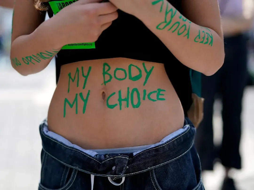 ▲️2022年5月,墮胎權利支持者在紐約聯合廣場參加“為墮胎權利而戰”集會,有人在肚子上寫上“我的身體,我的選擇”標語。