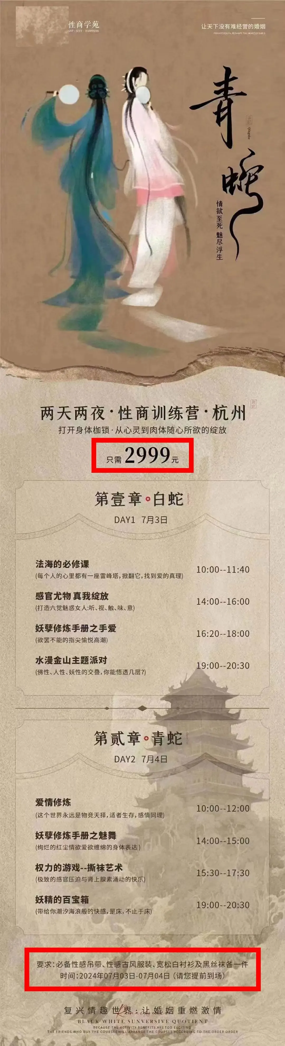 這個計劃本月初在杭州開拔的性商訓練營,時長兩天兩夜,一位收費2999,明文要求必備性感吊帶、性感古風服裝、寬鬆的白襯衫還得有黑絲襪各一件。
