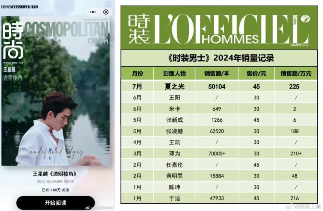 **在純割粉絲韭菜的雜誌銷量上,他們的表現均不如預期,完全沒法對標曾經的流量生。**比如王星越的6元電子雜誌銷量,不足2萬。鄧為、於適的雜誌銷售額均不如夏之光——看來還是耽改劇圈粉能力強,網盤見的《致命遊戲》仍為夏之光吸了不少粉絲。