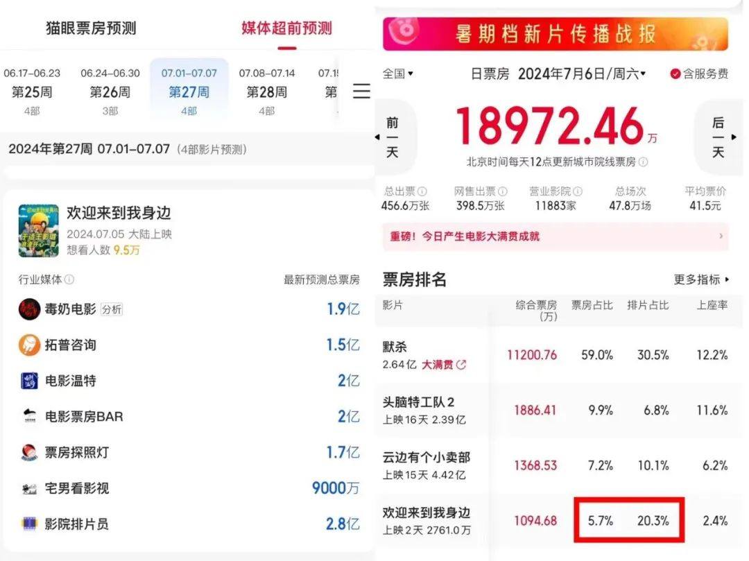 **更在預期之外的是,《歡迎來到我身邊》出現了令人瞠目結舌的票房倒掛現象。**上映第2日,全國影院給了它高達20%的排片,卻只換來一千多萬的票房,市場佔比僅為5.7%。就在同一天,上映16天、排片只有6.8%的《頭腦特工隊2》,比排片是自己3倍的《歡迎來到我身邊》多賣了近1倍。