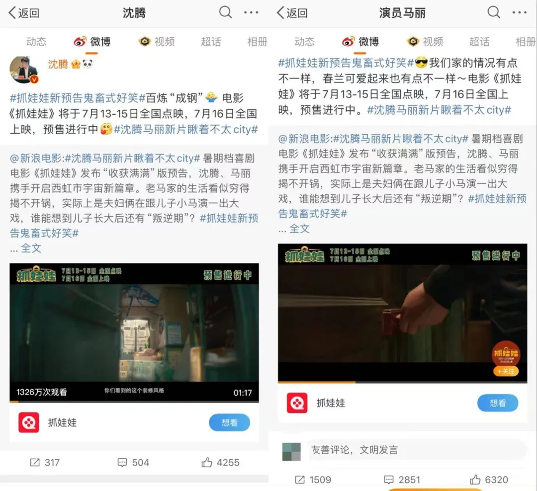 **這些年,稱得上“流量”的明星,都來自劇圈和偶像圈。**電影演員吸引來的粉絲,不同於狂熱的流量粉絲,更多表現為理性的路人粉。電影演員也不依賴於“死忠粉”做數據打投,更看重整體口碑與路人緣。沈騰、馬麗現在的微博點贊、評論只有幾百、幾千,但沒有人會懷疑他們在喜劇類型片上的票房號召力。