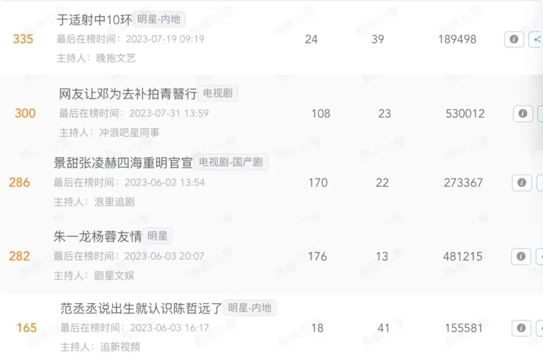 據熱搜引擎數據顯示,從2023年6月1日到2024年7月10日,於適從《封神》出道的這一年多里,他的微博熱搜多達335條。同一時間段裏,羣眾公認有流量的演員朱一龍才281條。而95生“待爆帝”張凌赫、鄧為、陳哲遠,分別為286,300、165條。