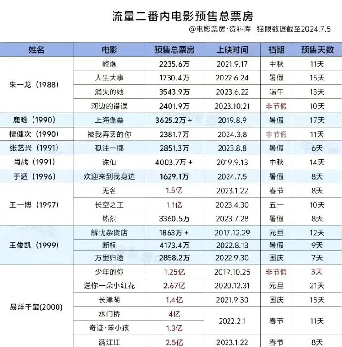**流量粉絲對電影票房的作用,主要體現在衝預售上,幫發行方省了很多事。**據電影票房·資料庫統計,稱得上流量的演員裏,只有易烊千璽、王一博實現了破億的預售成績。《歡迎來到我身邊》的預售為1629萬,和朱一龍的《人生大事》差不多。