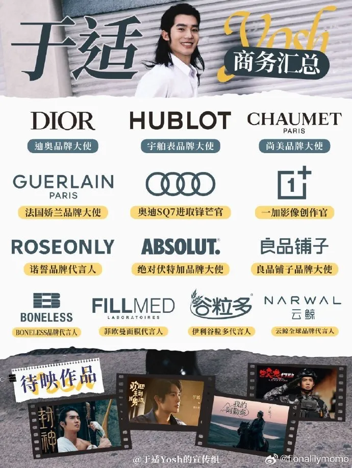 同時,為了和一眾流量生競爭商務,於適團隊鉚足了勁營銷其“獨特性”,凸顯其形象上的荷爾蒙氣質,區別於一眾古偶出身男星。最終,於適在品牌爸爸縮減預算的這一年,驚人地拿下了14個商代。