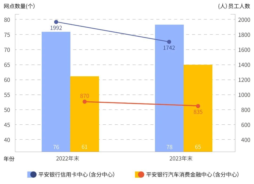 2022年末、2023年末,平安銀行信用卡中心(含分中心)網點數量分別為76個、78個,員工人數分別為1992人、1742人;2022年末、2023年末,平安銀行汽車消費金融中心(含分中心)的網點數量分別為61個、65個,員工人數分別為870人、835人。