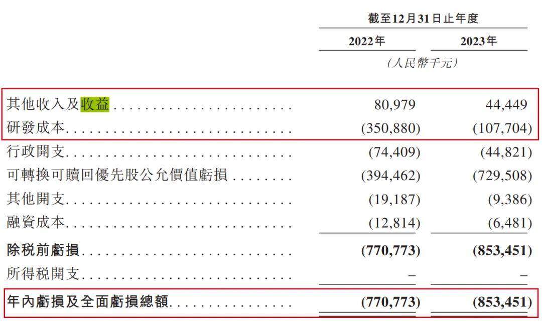 招股書顯示,2022年和2023年(以下合稱:報告期),公司通過政府補助、存款利息等方式獲得其他收入及收益8097.9萬元、4444.9萬元;而淨利潤分別虧損了7.71億元、8.53億元。