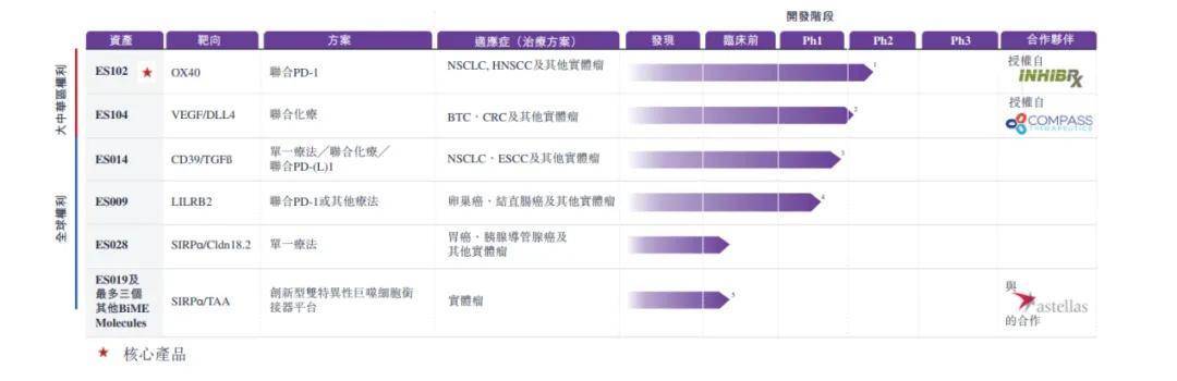 2018年,公司與Inhibrx訂立許可協議,獲得了進一步在大中華區開發、生產及商業化ES102(或INBRX-106)許可;2021年,公司與TRIGR(被Compass收購)訂立許可協議,可以在大中華區針對所有腫瘤適應症進一步開發、生產和商業化由ES104(或CTX-009)組成或含有ES104(或CTX-009)的醫藥產品。