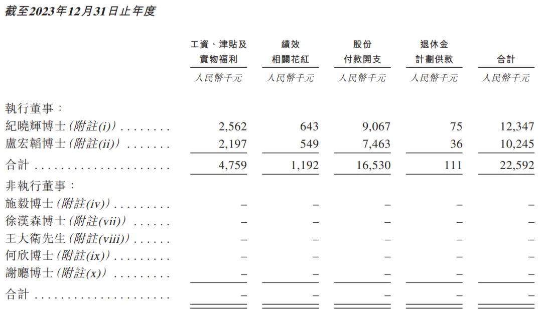 於報告期內,兩位創始人的薪酬均已經上千萬。2022年、2023年,紀曉輝獲得薪酬1340.2萬元、1234.7萬元;盧宏韜的薪酬為1084.8萬元、1024.5萬元。