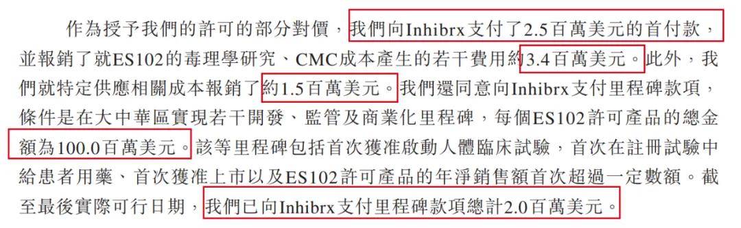 招股書顯示,公司向Inhibrx支付了250萬美元的首付款,並報銷了就ES102的毒理學研究、CMC成本產生的若干費用約340萬美元、就特定供應相關成本報銷了約150萬美元。