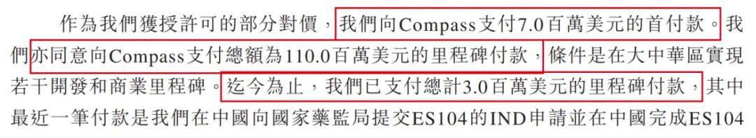 在ES104產品上,公司向Compass支付700萬美元的首付款,亦同意向Compass支付總額為1.1億美元的里程碑付款,條件是在大中華區實現若干開發和商業里程碑。