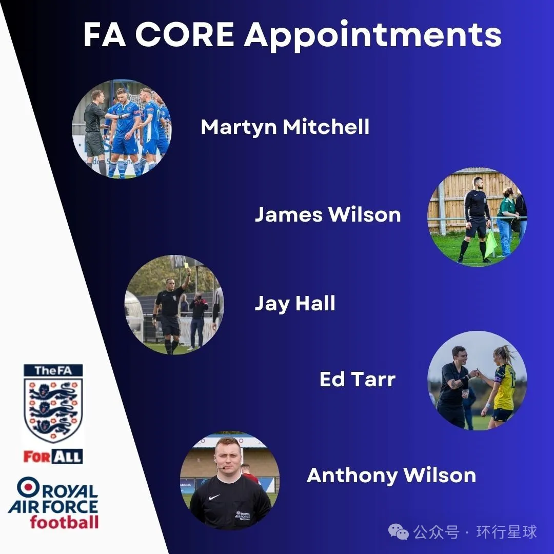 皇家空軍官網上祝賀以下裁判員被選為英足總裁判卓越中心 (CORE)