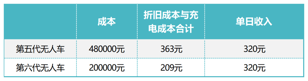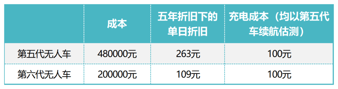不考慮安全員成本下,第五代車的成本為48萬左右,以五年折舊計算,單車每日的折舊成本為263元。