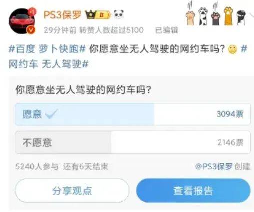 汽車博主PS3保羅曾在7月10日發起過一次微博投票,有近5千人蔘與投票,6成的參與人都把票投給了“願意”,這個支持率,比新能源汽車的滲透率還要高。